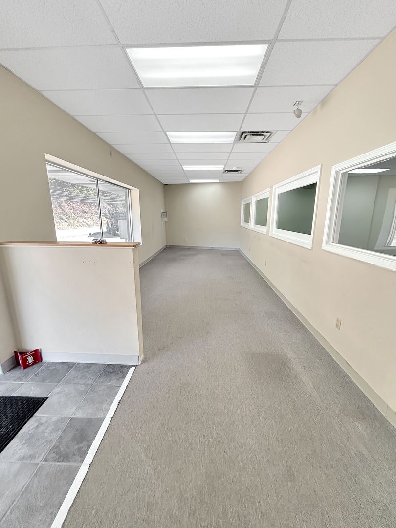 The suite features a bright open main area with high ceilings, durable flooring, and a private rear section with restroom and utility access. Large front windows provide natural light and excellent display potential for tenant branding.